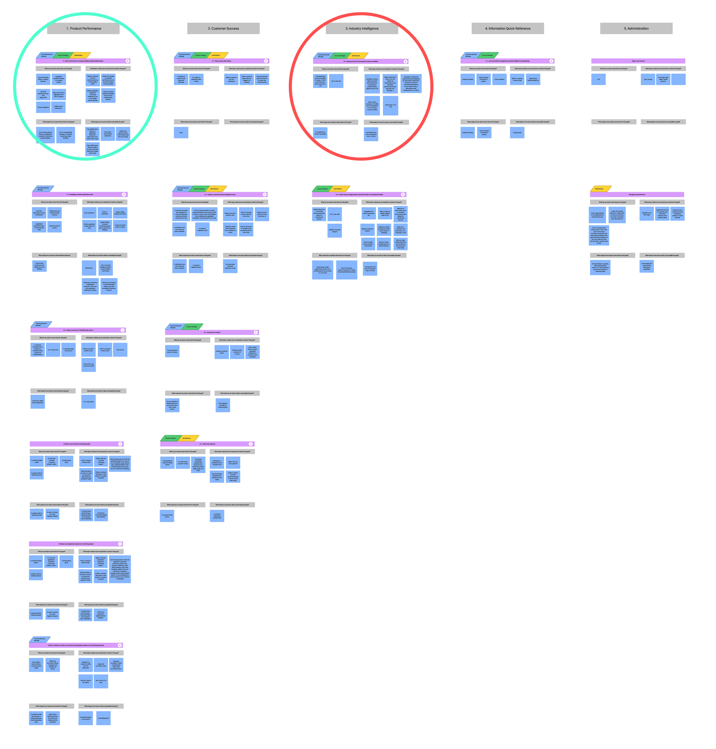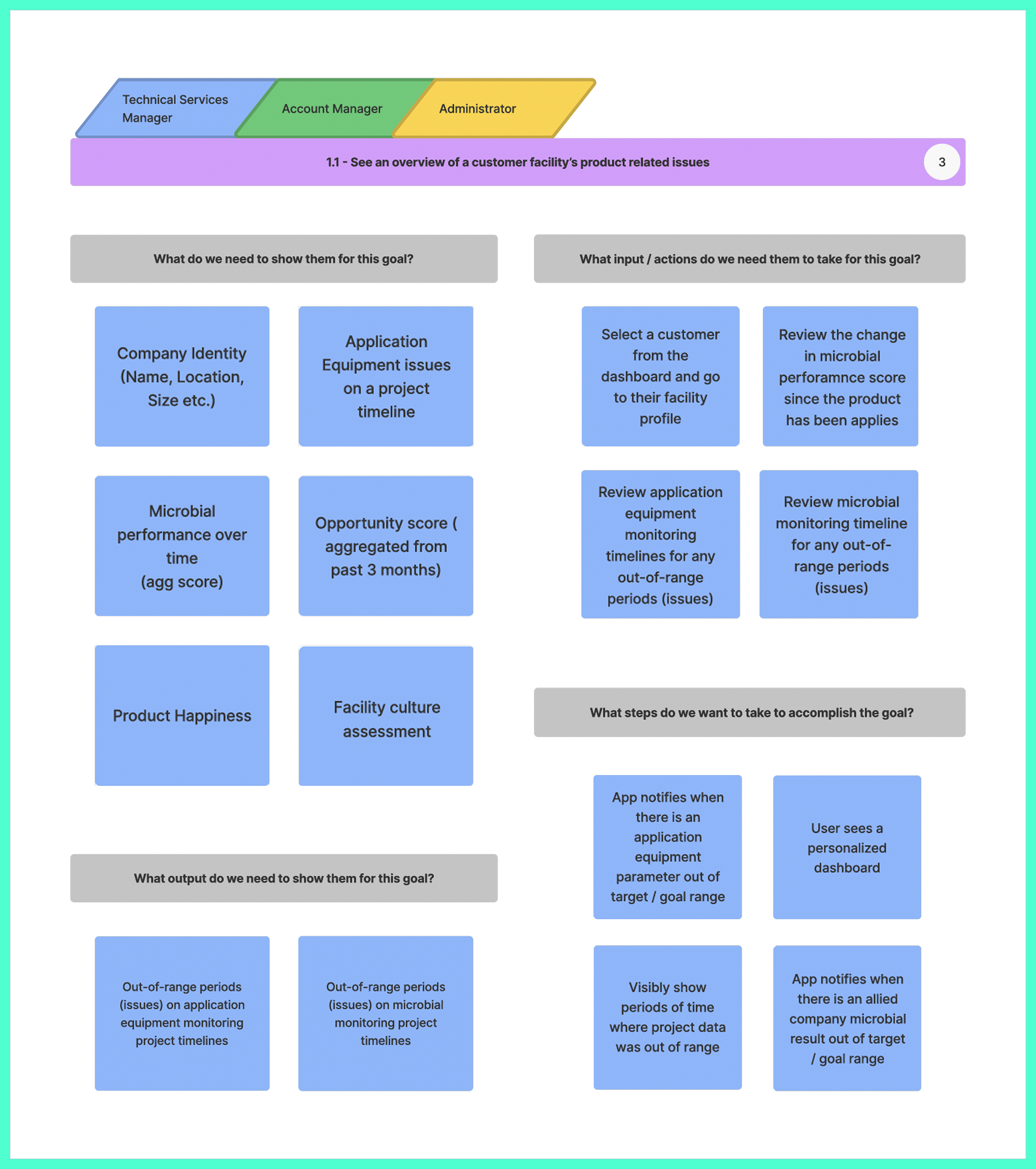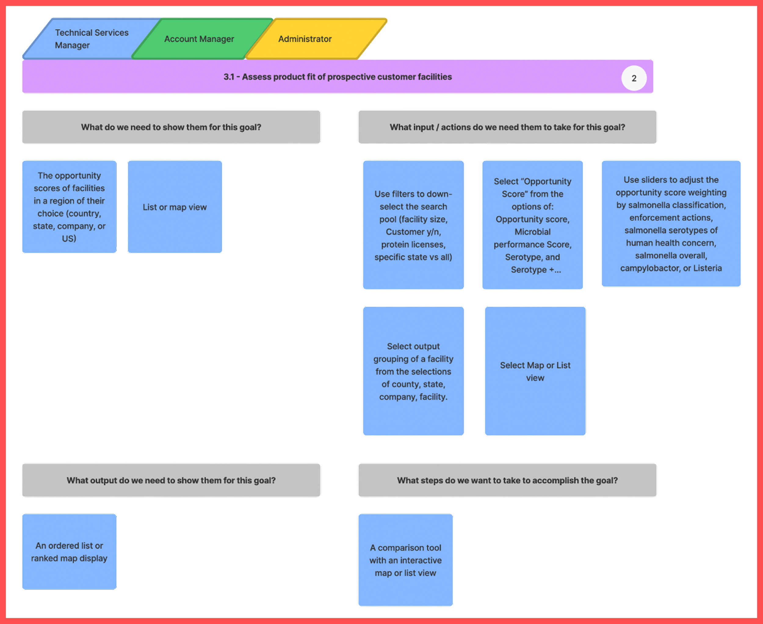 Through user stories we discovered 4 goals shared by all 3 user groups. The 2 most notable for feature selection and information architecture were: seeing an overview of a customer facility’s product related issues and assessing product fit of prospective customer facilities.